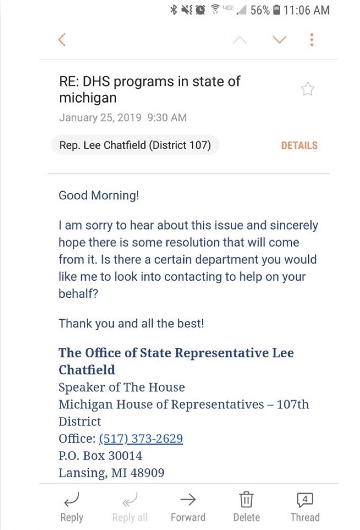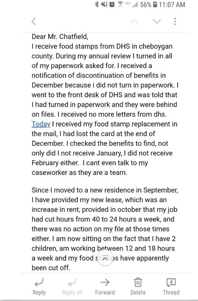 And what is the response of our local state legislators to this ongoing catastrophe, which coincides with an especially brutal winter? Chatfield ‘s office claims that he’s only heard from a few local constituents about isolated problems, and has forwarded their concerns to DHHS. Similarly, Schmidt — in his Cheboygan office hour on Jan. 21 and in his interview with MIRS — has claimed that “he has yet to hear of his constituents going without food or heat as a result, and if they were, he urged them to call his office so he could get it addressed.”