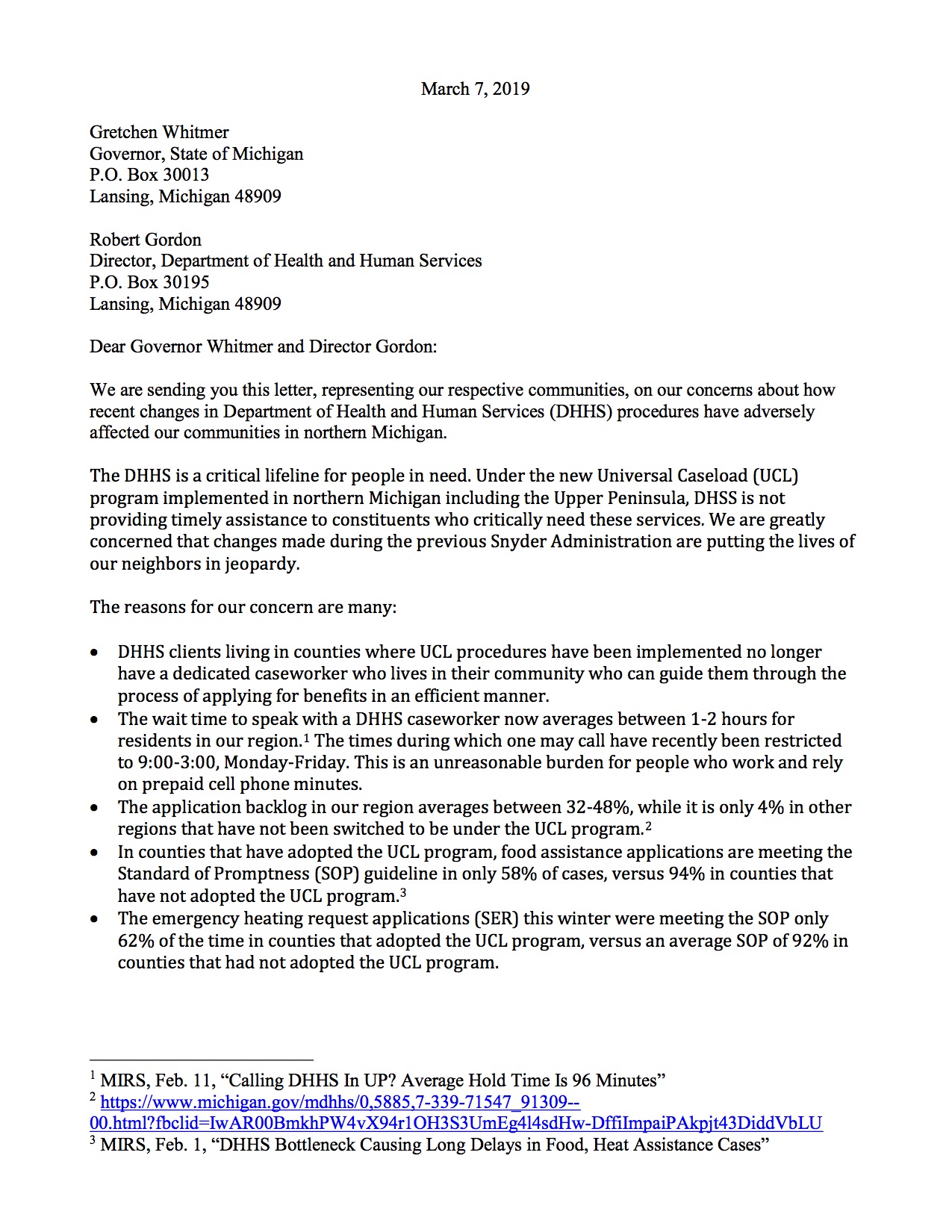 On December 7 of last year, concerned staff members of the DHHS attended a public forum in Cheboygan County to advise Rep. Chatfield and the general public about serious problems with the direction of the department: they warned that our neighbors would go without food, heat and medical assistance because of recent changes. Some of us in attendance at that meeting looked into those claims, made contact with informed sources, researched the problems, and worked with the press. When those problems were found to be credible, we informed our political representatives. Our local county chapters of the Democratic party felt the concerns were serious enough to warrant the following letter, addressed to the governor and new DHHS director: