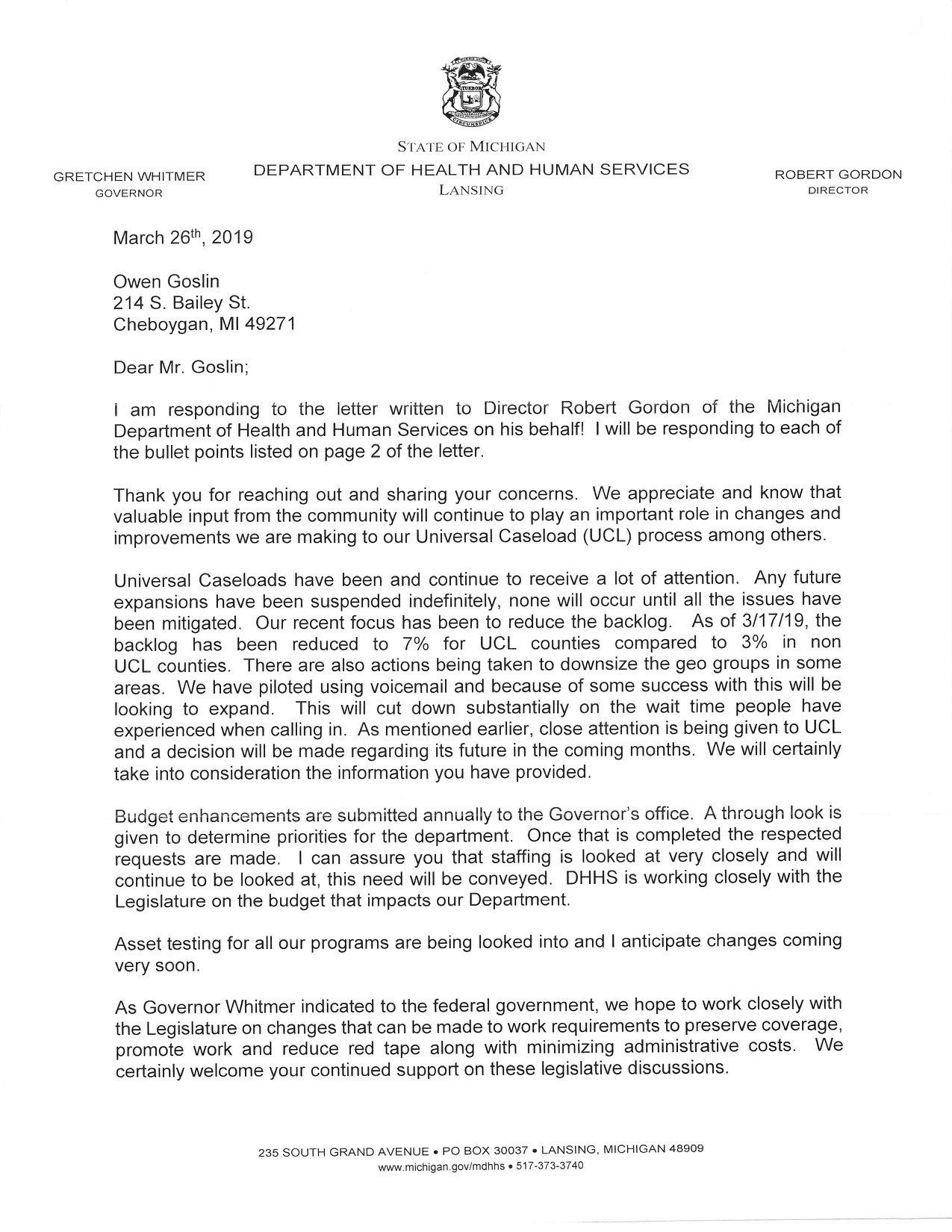There are several positive things mentioned in the DHHS letter: (1) the reduction in the backlog of cases (2) the strong suggestion that the department will request money for hiring staff (3) the promise of changes to the asset limits (4) the promise to mitigate the damage of the work requirements legislation. The letter is also more neutral on the Universal Caseload (UCL) program than in their Feb. 13 press release; the department now appears much less committed to maintaining this program.