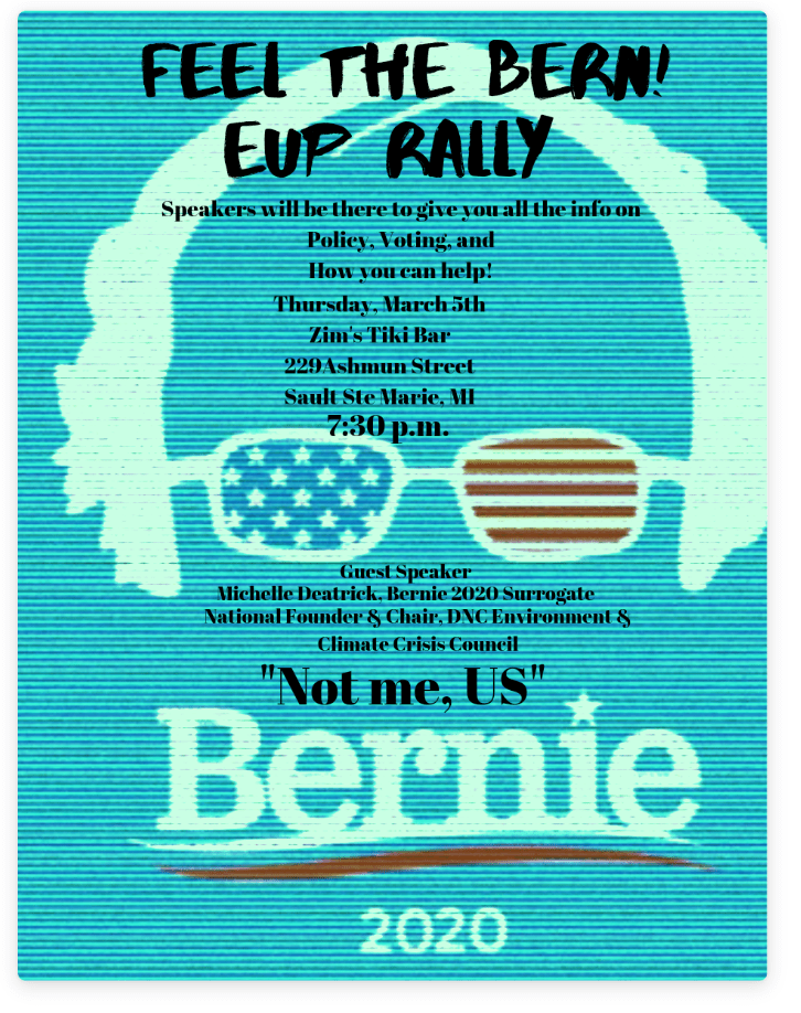 In the best of times our most vulnerable loved ones are at risk so what happens to them in the age of Covid-19 with our current healthcare and economic systems if they should contract the coronavirus? They are important, they are loved. Never before has Bernie’s platform and policies been more relevant than now in the age of Covid-19. This pandemic has brought to the forefront all the underlying systemic issues that Bernie’s campaign and policies address; the economic and racial disparities that exist for the majority of us. In the best of times most of us here in the 1st Congressional District struggle with access to quality and specialized medical services, mental health services, low wage seasonal work, lack of economic opportunities, lack of quality connectivity (internet and cell reception), revitalizing our rural communities, empowering tribal nations, shutting down Line 5, public education just to name a few, the list goes on and on… Now in these uncertain and unprecedented times, these struggles are bubbling over like never before and only Bernie’s policies have real equitable, long-lasting solutions. Remember this is not about me, it’s much larger than that, it’s about us. Not me. Us!